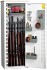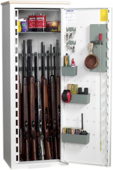 På bilden inrett för 16 vapen. Den flyttbara överhyllan kan ersättas med ett låsbart fack, som finns som extra tillbehör. Skåpet kan utrustas med brandbox.