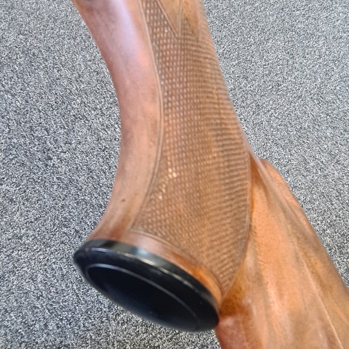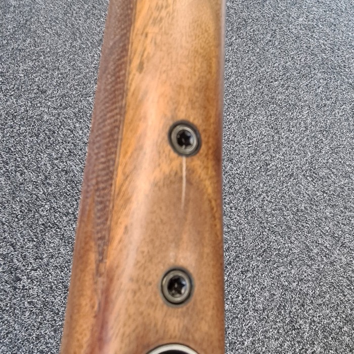 Några mindre märken i kolv som det finns bilder på. Träbiten är lite torr så med olja kommer märkena inte alls synas lika tydligt. Rembygelknopp saknas på kolv bak.