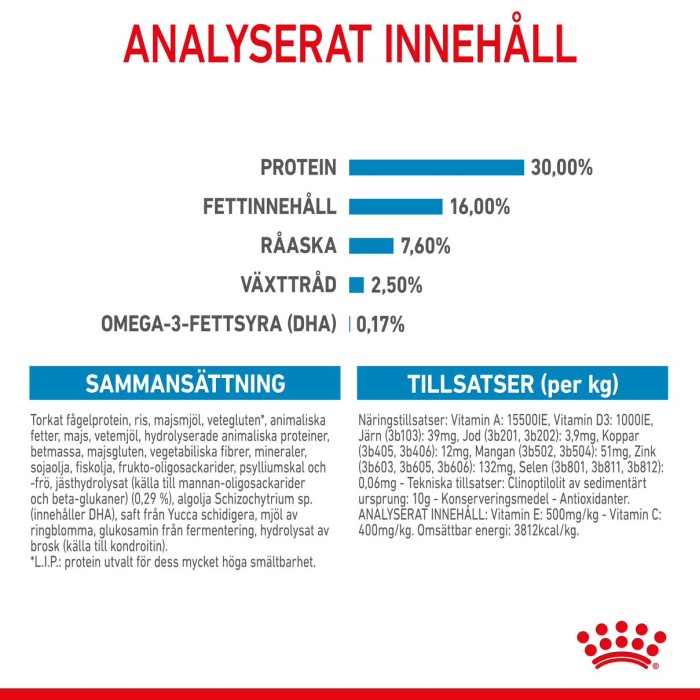 Ris, torkat nöt- och fläskprotein*, torkat fågelprotein, animaliskt fett, majsmjöl, mineraler, hydrolyserat animaliskt protein, majsgluten, betmassa, cellulosafiber, majs, vegetabiliskt proteinisolat*, torkat fläskprotein, sojaolja, fiskolja, psylliumfrön/skal, frukto-oligosackarider (FOS), jästhydrolysat (innehåller mannan-oligosackarider (MOS)), skaldjurshydrolysat (innehåller glukosamin), tagetesextrakt (innehåller lutein), hydrolysat från brosk (innehåller kondroitin).